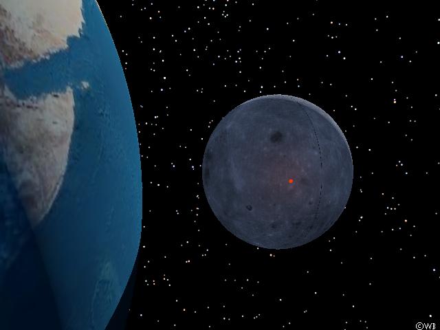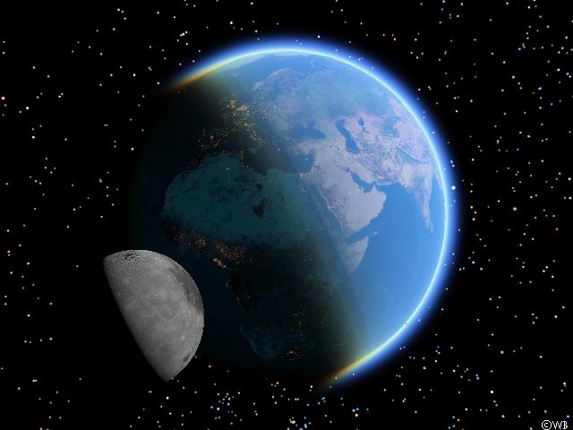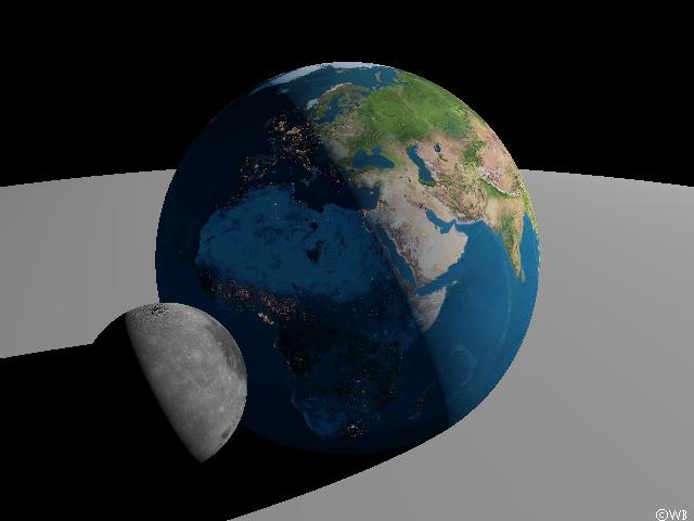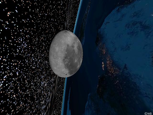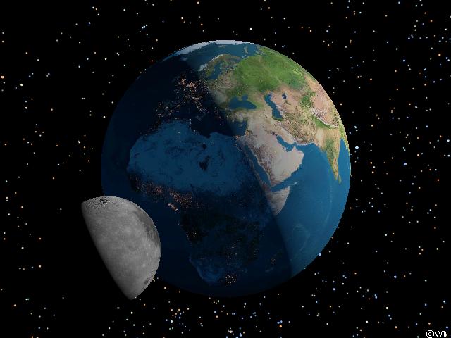 To improve realism of the situation the `lab desktop’ is preferably to be eliminated from the scene. In reality the system of Earth and Moon is embedded within the star-filled celestial background, and accordingly in this next simulation image the Moon is shining above the nocturnal central parts of Africa in front of the starry sky. Its data were provided by the SAO catalogue of the 258.000 brightest stars (compiled by the Smithsonian Astrophysical Observatory). Data from the Earth’s surface (day and night part) came from Living Earth®, the Moon’s surface has been constructed using data from the US space probe Clementine.