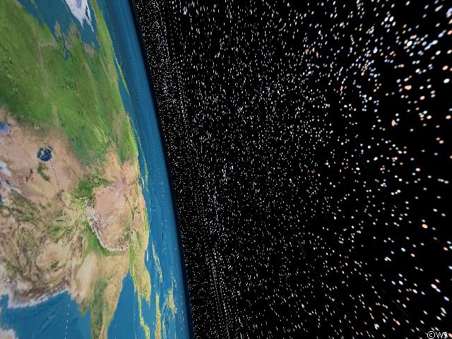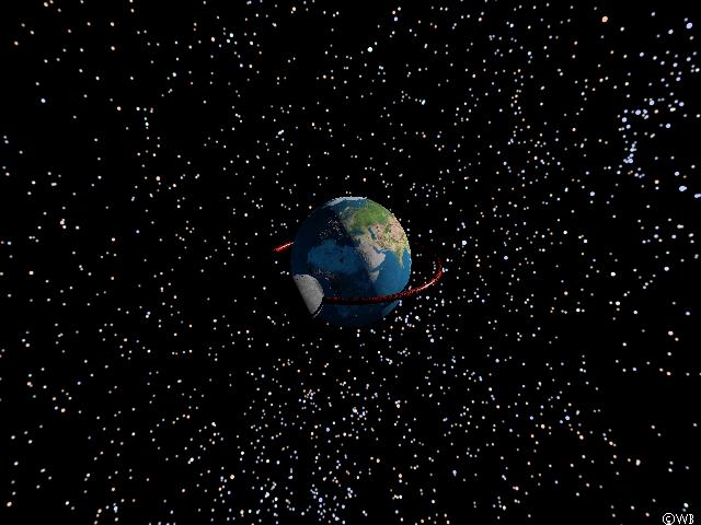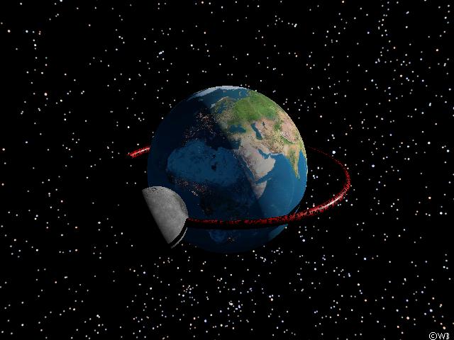 The scene could be rendered even more realistic if the earth’s atmosphere is taken into account also (which is enlarged here by a factor of 15 as compared to its true extension). Please note the appearance of the atmospheric reddening at the poles near the terminator, demonstrating the aurora as seen from space. Unfortunately the addition of atmospherical effects increases computation time by a factor of 60. Therefore the succeeding simulations have been made `in vacui’.