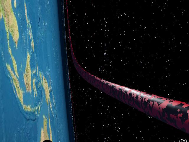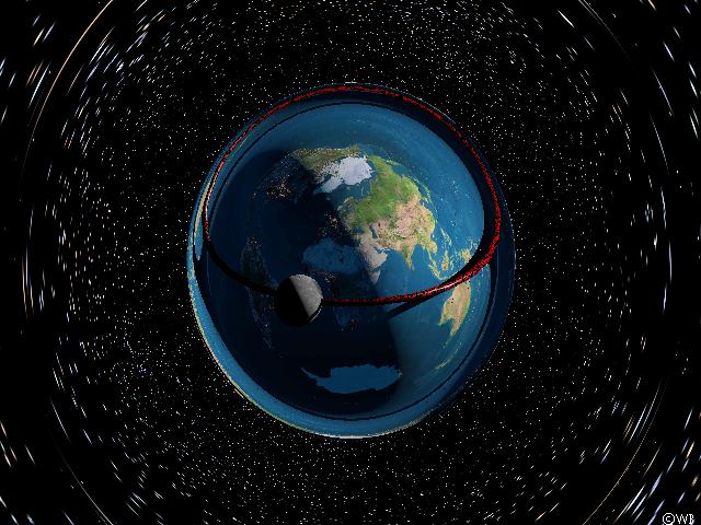 Well, at last: if indeed light is able to rotate along the Photon Orbit, then it should be possible to see the Earth’s surface arbitrary times, because light may take a turn around the Earth more than once until it comes down touching the surface. Unfortunately the Moon itself hides the view path along the Photon Orbit in the previous images. Therefore we should set the Moon onto a somewhat more distant orbit and – voila! – beyond the night side, beeing itself behind the day side, there appears the day side again. By estimation it is Indonesia, which is hereby seen the second time, possible because of a complete Earth turn around of the light. The first time Indonesia is visible just below the observer, as it is shown in the previous images (like the tangential view along the Photon Orbit). This first image is located at nearly the position were it is to be expected in the flat space scenario. However, the view field in this image is only a very small section of 1° along the horizon. If one would select even smaller view fields, one could see even more repetitions of the same geographical areas, each repetition stretched more than the previous one by large amounts, and each one being lots smaller than the previous appearances. As mentioned earlier, the Photon Orbit is an instable circular orbit.