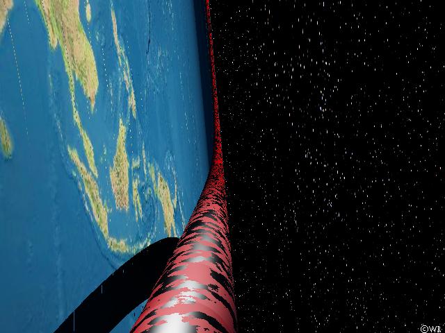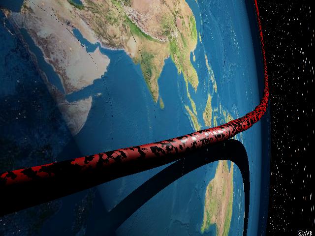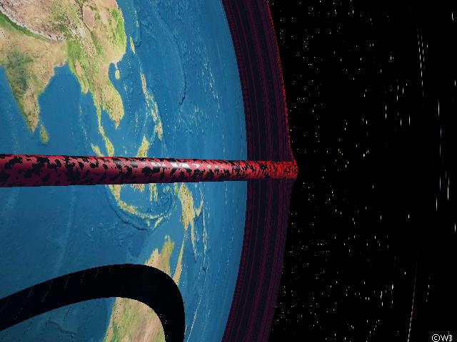 But now the space ship shall take a stop exactly at the Photon Orbit, somewhat above the torus, such we have a tangential view along the torus. And, as it is to be expected: The torus, which truly circulates the Earth, appears to be a straight line, since the curved path of light rays is parallel to the curved torus everwhere arround the Earth! Of course at some distance the torus seems to be bent northwards, as it is known already from the former simulations. The straightened torus can’t disappear behind a horizon formed by Earth’s surface, as it would be the case in flat space, since there is no more such kind of horizon when the entire surface is visible. On the other hand the torus also can’t get lost in infinity, as it were expectable with an infinite bar in flat space, because the torus is a finite object of finite length.