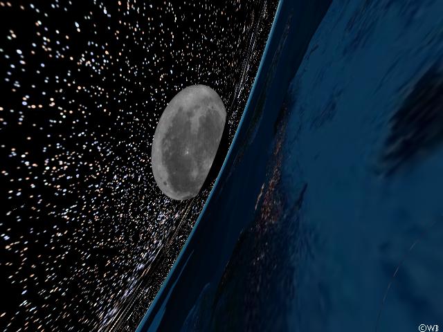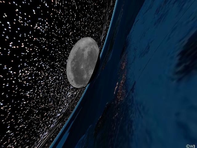 But there is a solution to stop disappointment because of this `boring’ appearance: Let’s play God again and set an artificial torus around the Earth, just at the radius of the Photon Orbit. One may consider this torus as some kind of `hyperfinanced space station’ (it’s a simulation!). The Moon, residing at the Photon Orbit also, becomes therefore be `pierced’ by this torus.