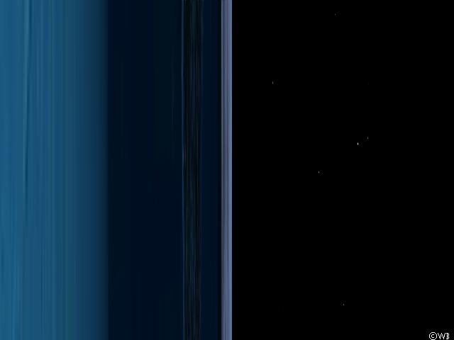 But now let’s go back somewhat outwards, up to the more interesting regions around the Photon-Orbit, which was mentioned already. At first impression this position doesn’t appear very exciting. Neither the view towards the Moon, nor the view in the opposite direction seem to be very particuliar. Again, the stars become more and more distorted near the horizon, and, as before, the day side is visible beyond the night side and vice versa, which is a hint to the strong curvature of space at this place, but it doesn’t look too interesting at all. Could this really be the region of rotating photons?