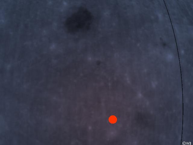 This isn’t very impressive. The Moon’s structure doesn’t contain enough detail of high contrast such that anything could be recognized in the photon-orbit distorted appearance. There is no definite distinction to some bright area at the Earth’s surface itself. Once again, this requires the experimentator to play the role of God and insert a light source like a small shining reddish sphere into the scenery. If positioned onto the backside of the Moon, it becomes a somewhat more complex structure. In the flat space, this scenery looks like this image.